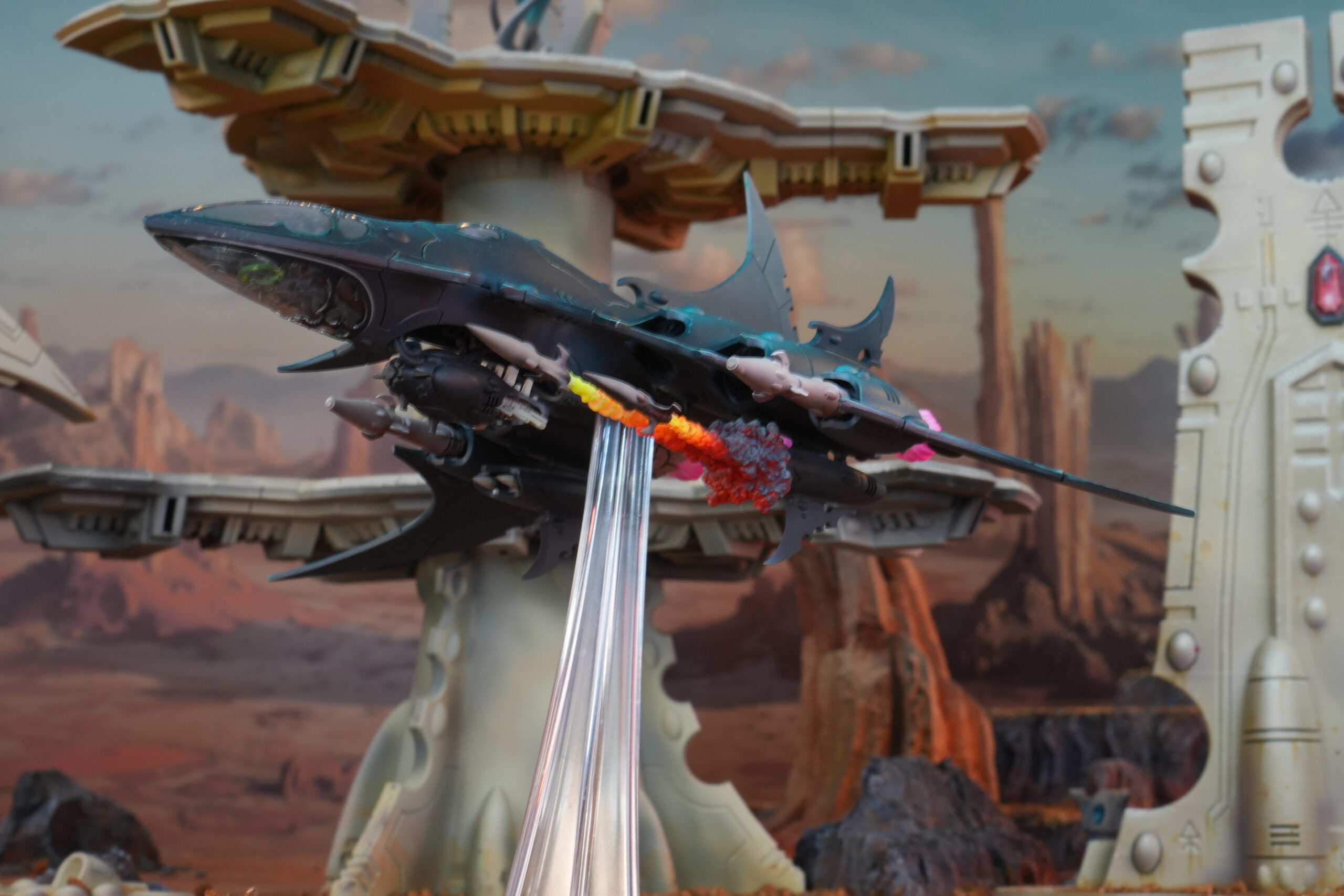 Rain death from above with our custom 3D-printed effects for the Drukhari Voidraven Bomber. This set includes curling smoke trails for both missiles, a devastating void lance muzzle blast, and an array of thruster effects to capture the raw speed and ominous power of the Voidraven in flight. Designed to enhance its lethal…