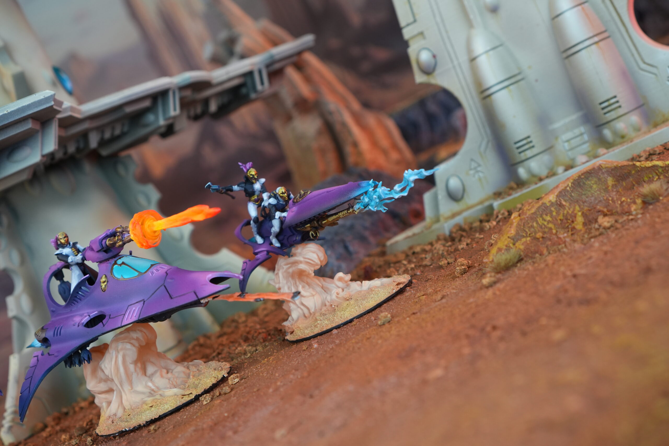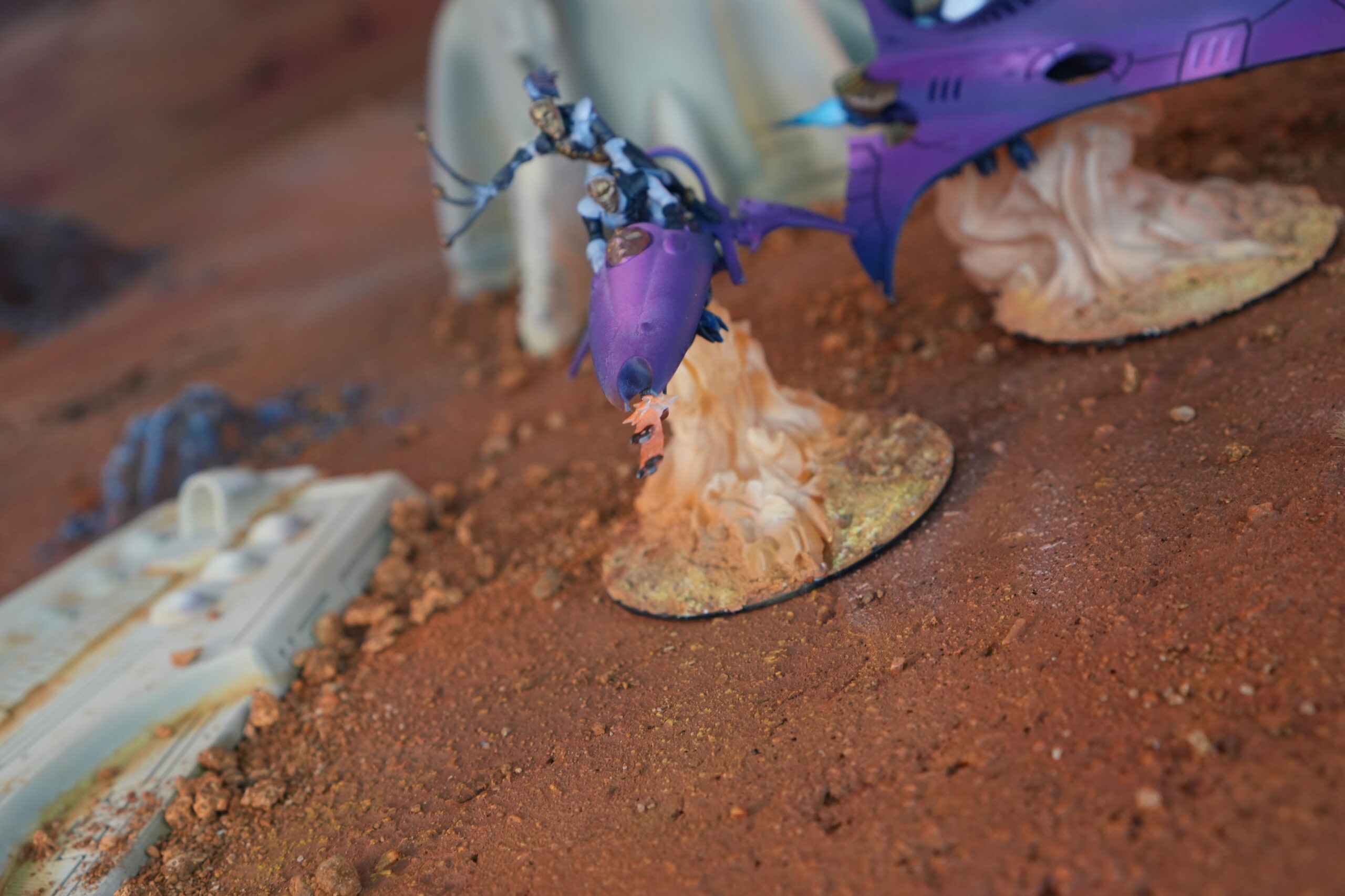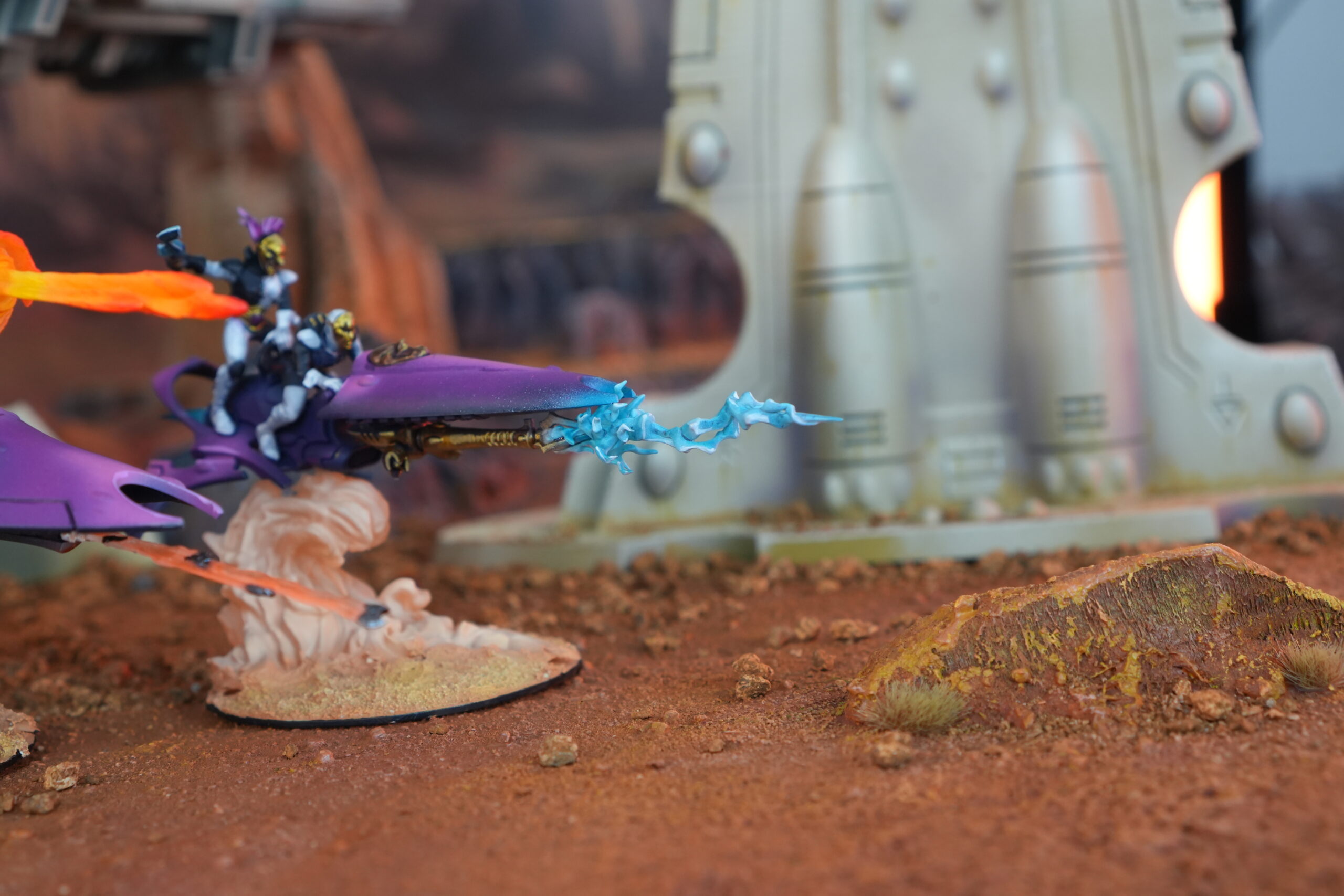 Capture the speed, grace, and lethality of the Harlequin Skyweavers with our custom 3D-printed effects. This set includes a crackling haywire cannon energy ray, a cloud-kicking flying dust base, multiple thruster bursts, and a variety of shuriken weapon muzzle flashes — all designed to showcase the blistering velocity and deadly elegance…